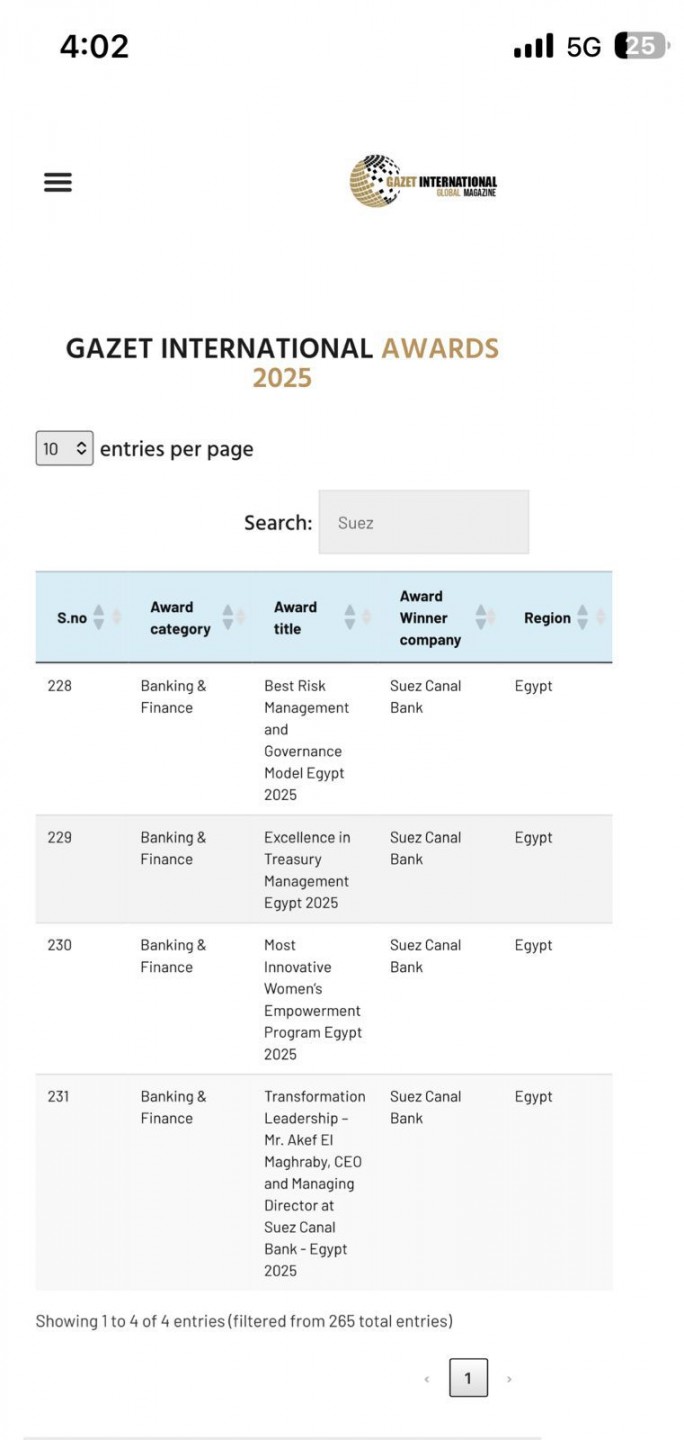 بنك قناة السويس يحصل على 4 جوائز دولية ضمن Gazet International Awards 2025