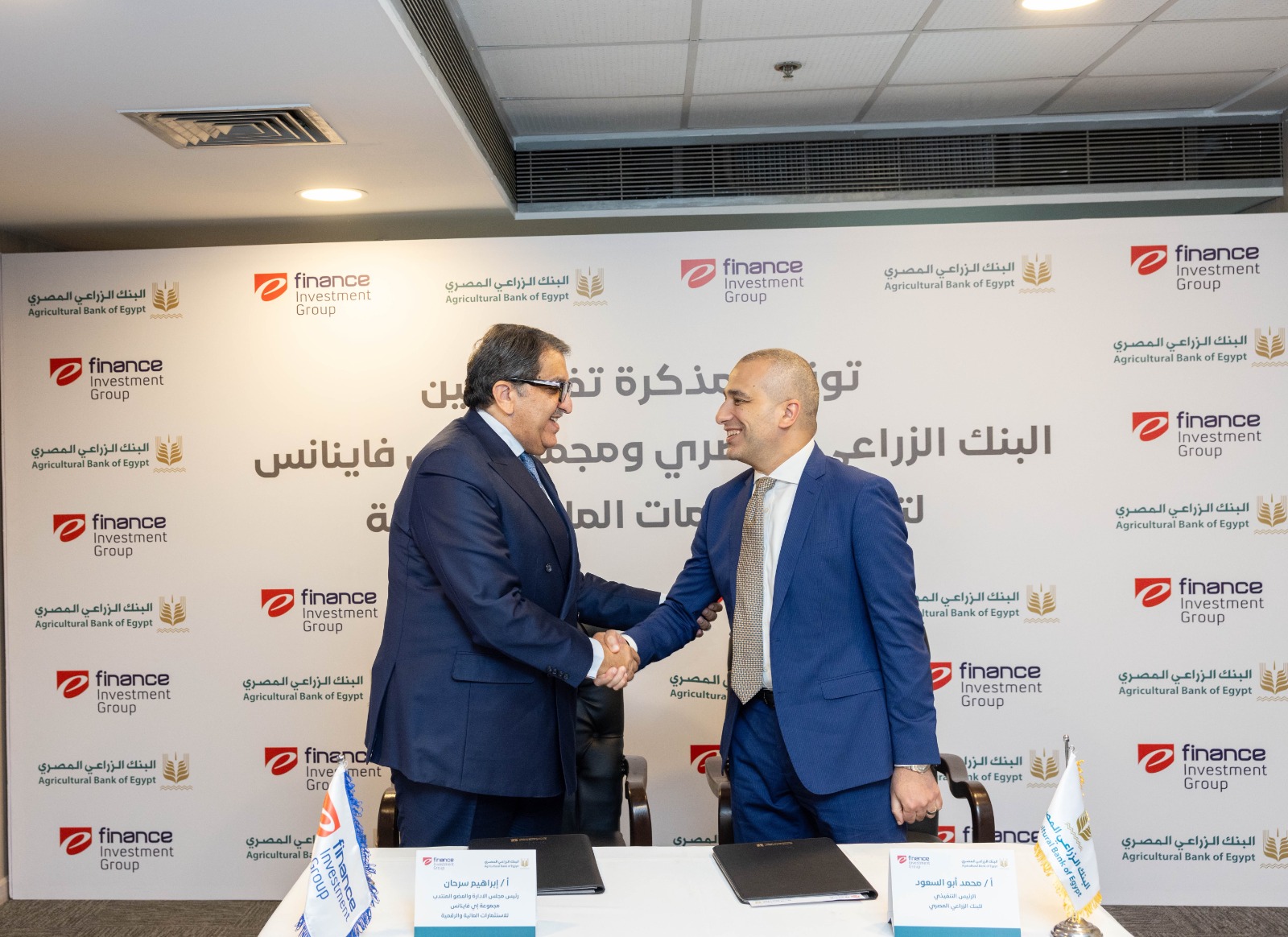 وقع مذكرة التفاهم، محمد أبو السعود، الرئيس التنفيذي للبنك الزراعي المصري، وإبراهيم سرحان، رئيس مجلس الإدارة والعضو المنتدب لمجموعة "إي فاينانس"، وذلك بحضور سامي عبد الصادق، وغادة مصطفى، نائبا الرئيس التنفيذي للبنك الزراعي المصري، ومحمد السويسي، رئيس مجموعة المنتجات والخدمات الإلكترونية بالبنك، وعادل مبارك، الرئيس التنفيذي لشركة اي أسواق التابعة للمجموعة، والمهندس ياسر عزت، رئيس أول قطاع المشروعات بشركة اي فاينانس لتشغيل المنشآت المالية، وعدد من قيادات البنك والمجموعة.