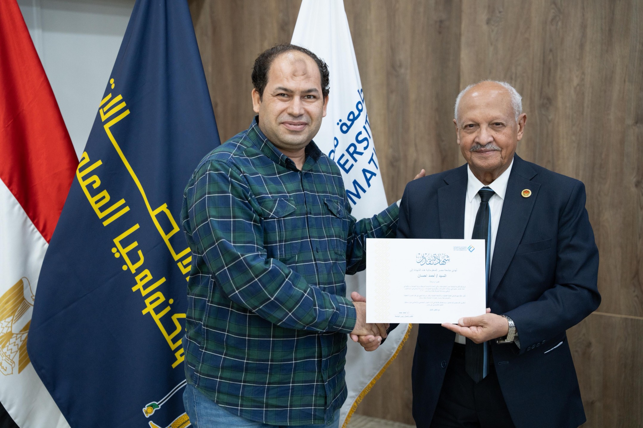 وعلي هامش الزيارة سلم الدكتور أحمد حمد 50 من الصحفيين والصحفيات شهادات تقدير تكريما لجهودهم في نشر رسالة الجامعة والتعريف بما تحققه من إنجازات بحثية، وما يقدمه طلابها وأعضاء هيئة التدريس من جهود للارتقاء ببلادنا العزيزة، كما سلم شهادة تقدير باسم الراحلة الكاتبة الصحفية لمياء عبد الحميد نائب رئيس تحرير جريدة المساء، تقديرا لرحلة عطائها الممتدة لأكثر من 30 عاما في بلاط صاحبة الجلالة وتخصصها في تغطية اخبار قطاع الاتصالات وتكنولوجيا المعلومات وجامعة مصر للمعلوماتية.